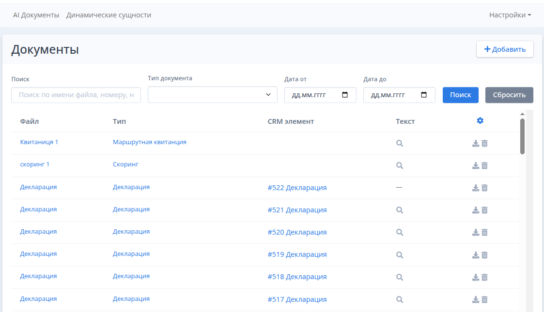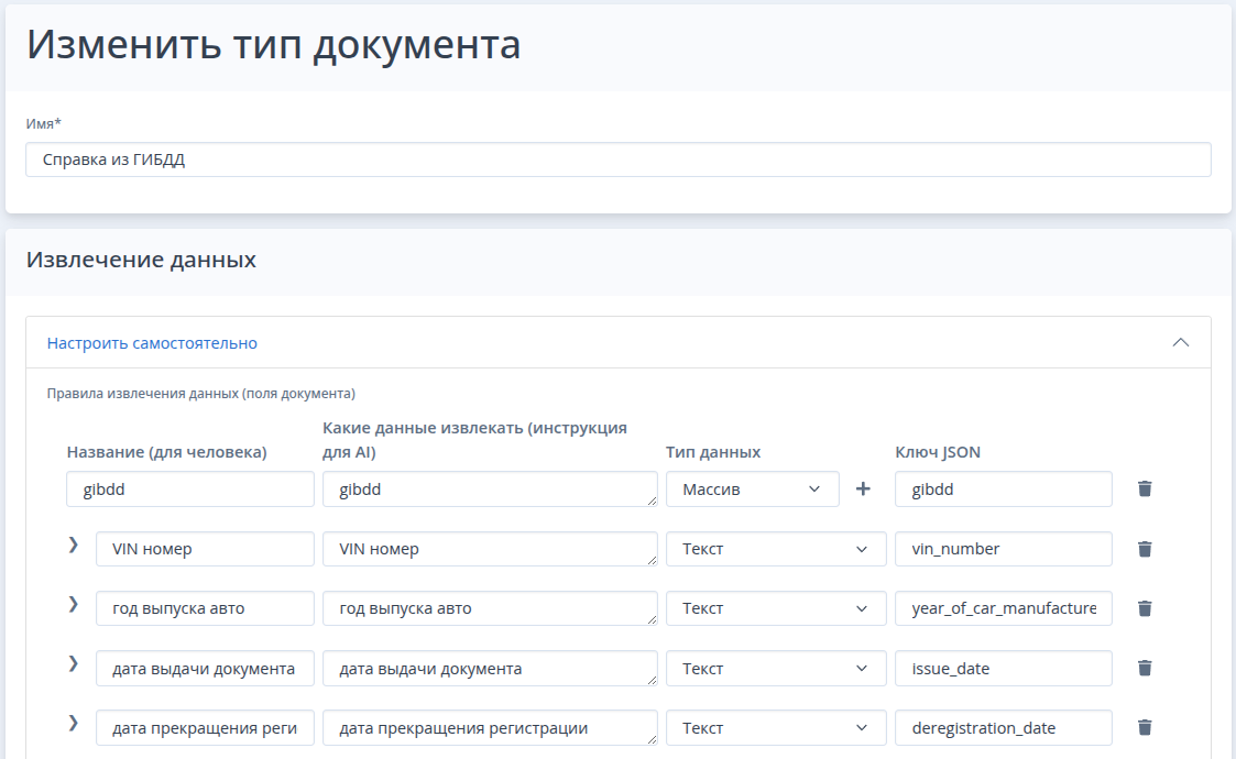- Система автоматически распознает его тип, извлекает все заданные данные и сохраняет в указанные поля.