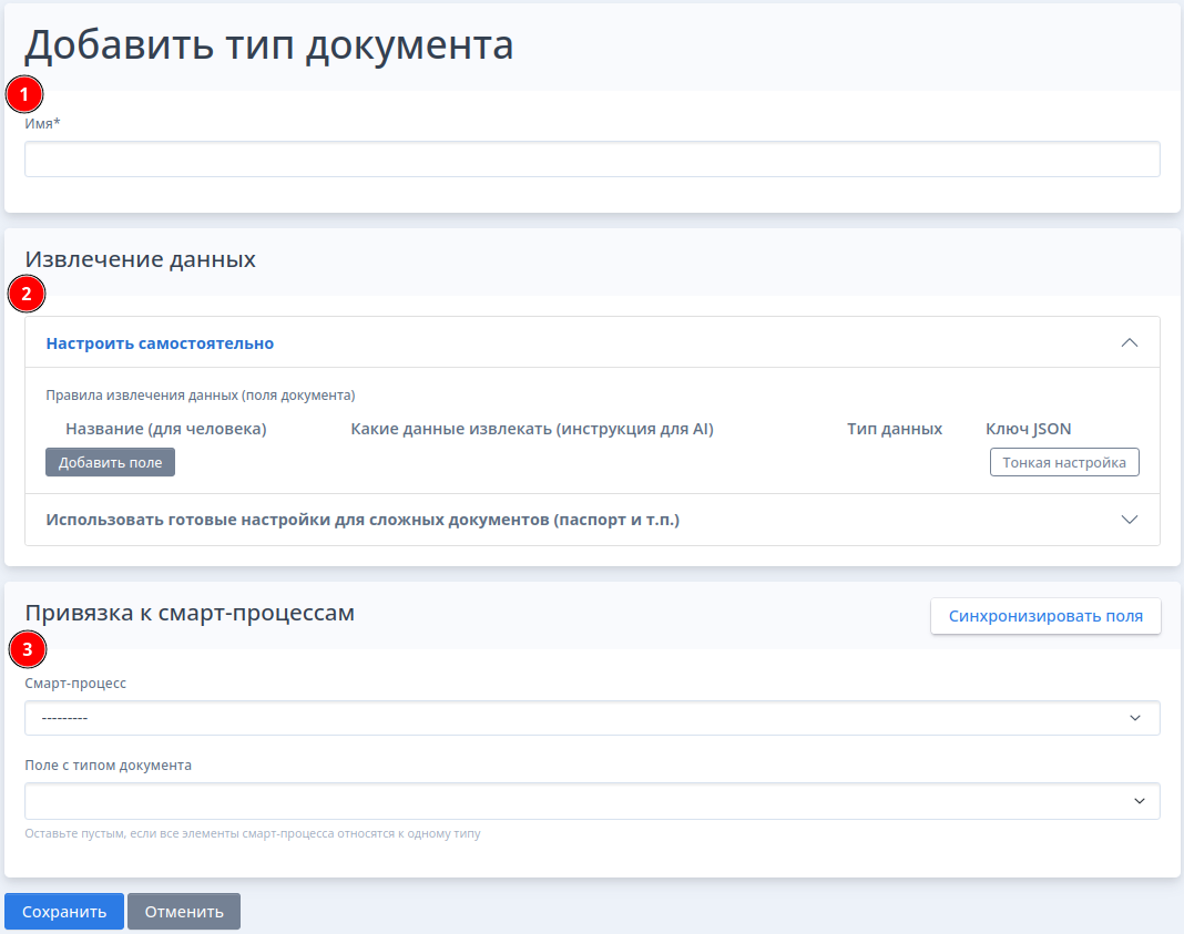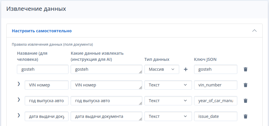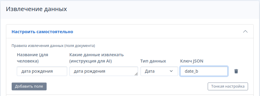 - Указать инструкцию для искусственного интеллекта (инструкция для ИИ должна кратко и четко формулировать какие ключевые слова должен искать искусственный интеллект, чтобы извлечь данные: например - дата рождения или дата выдачи документа. Не указывайте неполные данные, например: дата - ИИ не поймет какую дату искать. )