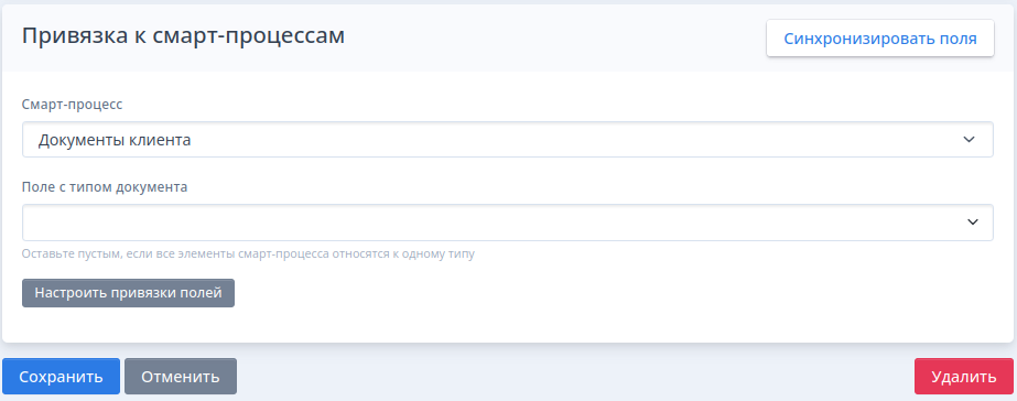 - Выберите поле смарт-процесса с типом документа (если все элементы смарт-процесса относятся к одному типу, то оставьте поле пустым)