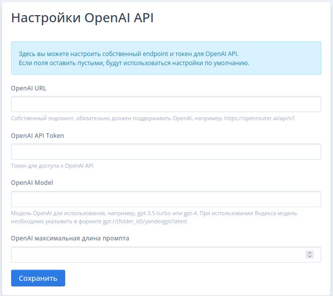 - Установите значение Собственного эндпоинта (URL с адресом API, поддерживающего OpenAI, например, https://openrouter.ai/api/v1)