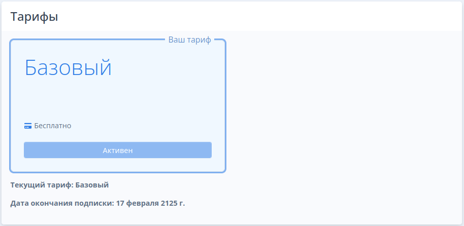 Раздел отображает текущий тариф и доступные тарифы для подключения