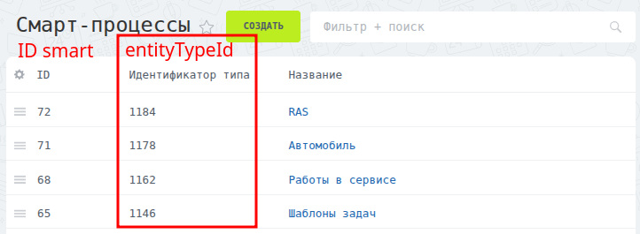 В Битрикс24 наименование сущностей пишется заглавными буквами, в поле настроек шаблона допускается использование строчными буквами. С полным списком сущностей и их описанием можно ознакомиться на портале Битрикс24 в разделе документация API