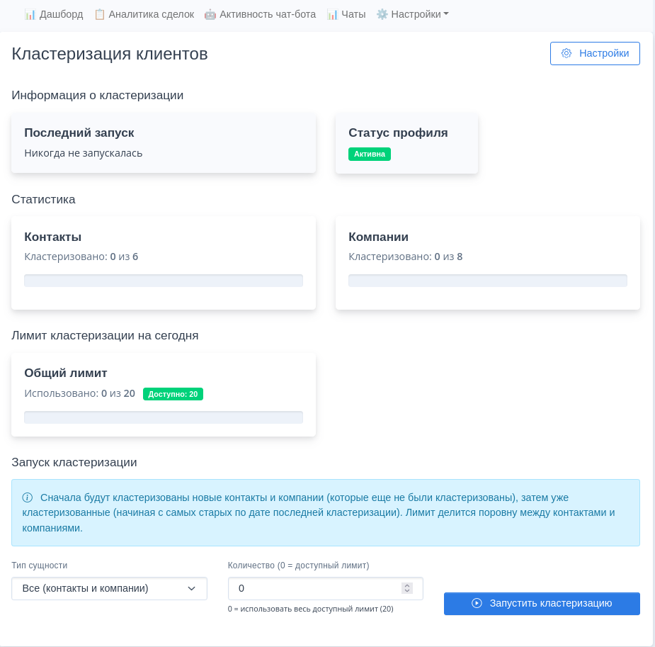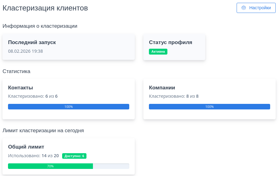 - Общий и оставшийся лимит компаний для кластеризации в соответствии с тарифом.