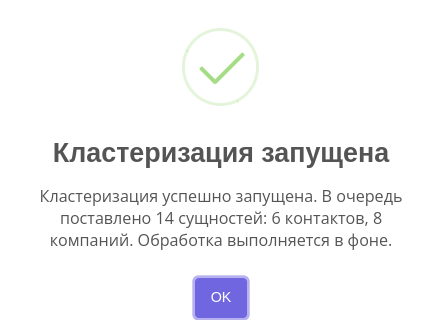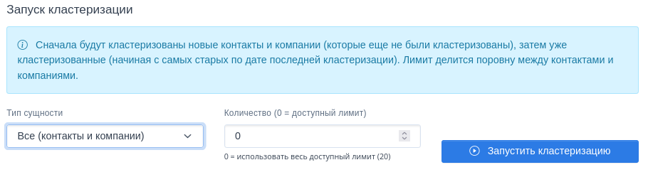 Сначала будут кластеризованы новые контакты и компании (которые еще не были кластеризованы), затем уже кластеризованные (начиная с самых старых по дате последней кластеризации). Лимит делится поровну между контактами и компаниями.