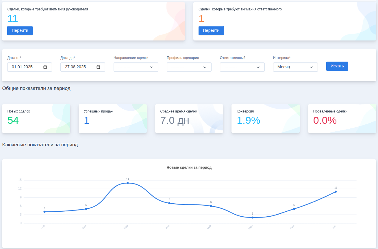 - Наглядные показатели и графики в реальном времени: эффективность менеджеров, объем сделок, динамика воронки и прогноз закрытия.