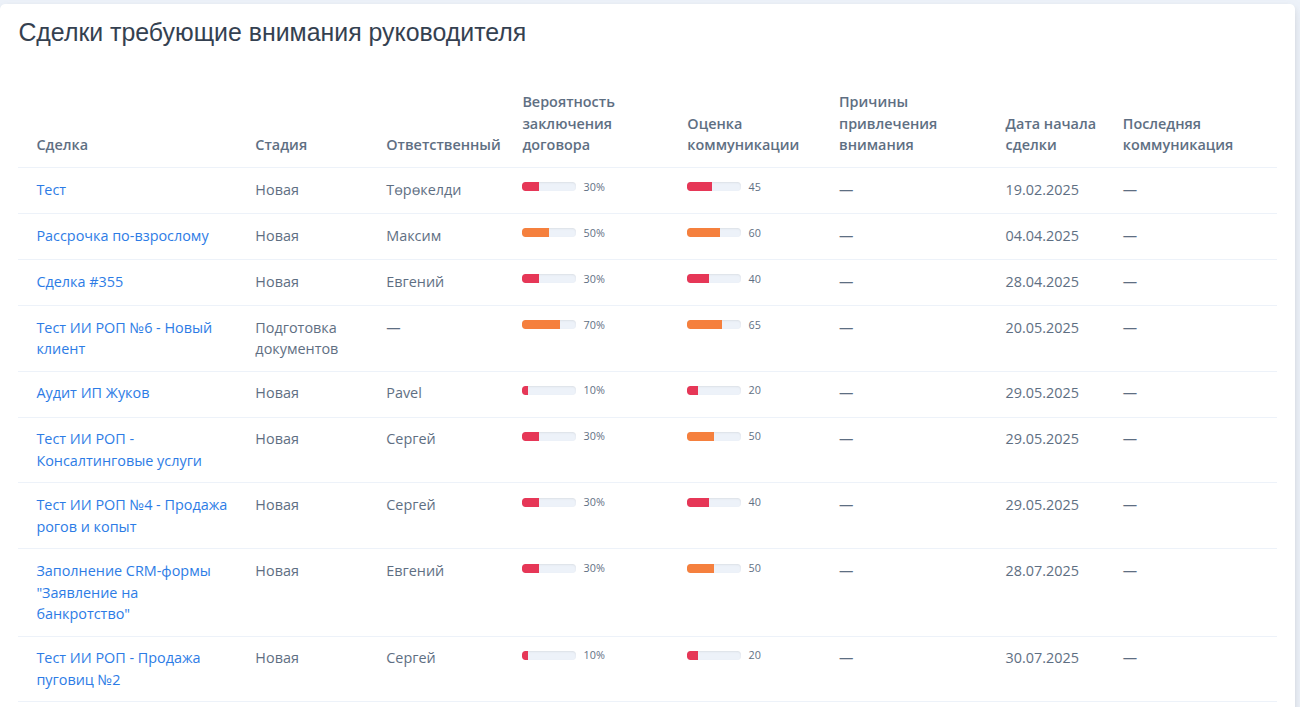 - Руководители и ответственные могут быстро перейти, прямо из дашборда, к сделкам требующим внимание.