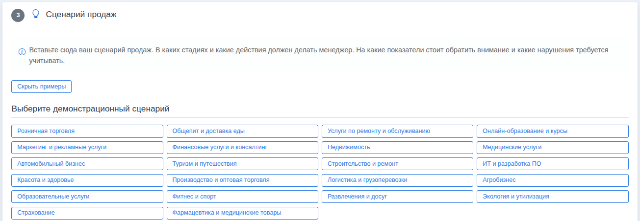 - В настройках приложения выберите сценарий для анализа сделок/лидов/других действий менеджеров (в настройках представлены множество готовых сценариев, доступные для редактирования под специфику вашего бизнеса)